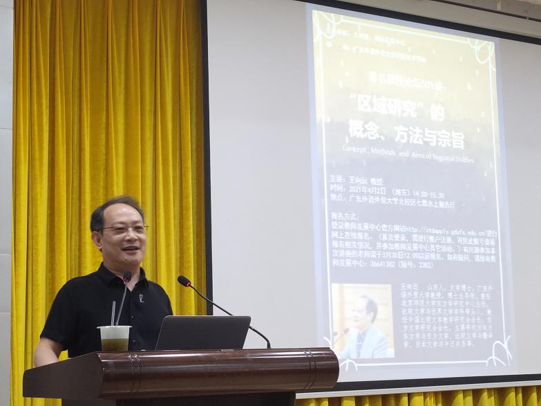 4月2日,由人事处、教师发展中心主办、广东外语外贸大学日语亚非学院协办的著名教授论坛第501讲“‘区域研究’的概念、方法与宗旨”以线上线下结合的方式在广东外语外贸大学北校区七教水上报告厅及腾讯会议同时举办。本次讲座邀请了广东外语外贸大学东方学研究院学术院长、博士生导师王向远教授作为主讲人。广东外语外贸大学日语亚非学院院长陈多友教授,副院长张秀强教授,副院长张志刚教授以及来自我校及全国各大高校的共200余名师生出席了本次讲座。本次讲座由日语亚非学院社会文化系主任程亮副教授主持。